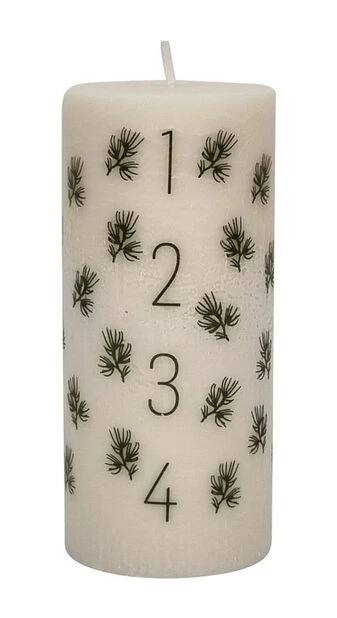Tradisjonelt adventslys i stearin med dekorative furukvister. Tell ned til jul med et adventslys nummerert fra 1 til 4 som gjør ventetiden mer stemningsfull. Svanemerket kubbelys med brennetid ca. 60 timer. Selges stykkevis.