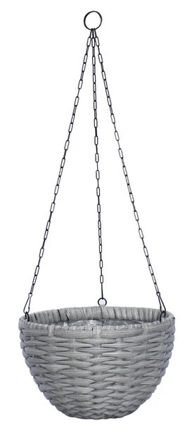 Moderne, rund hengeampel i flettet kunstrotting med plastbelagt innside. Kjettinger for opphenging. Passer godt til rottingmøbler. Diameter: 30 cm.