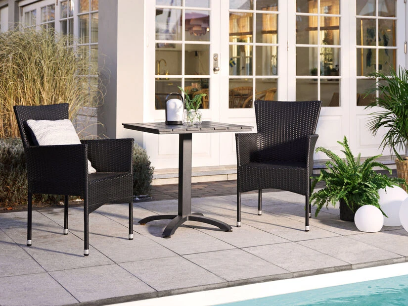 Praktisk lite bord til balkongen eller den lille uteplassen. I aluminium med bordplate i lettstelt nonwood. MÄl: 70 x 70 cm, hÞyde 69 cm.