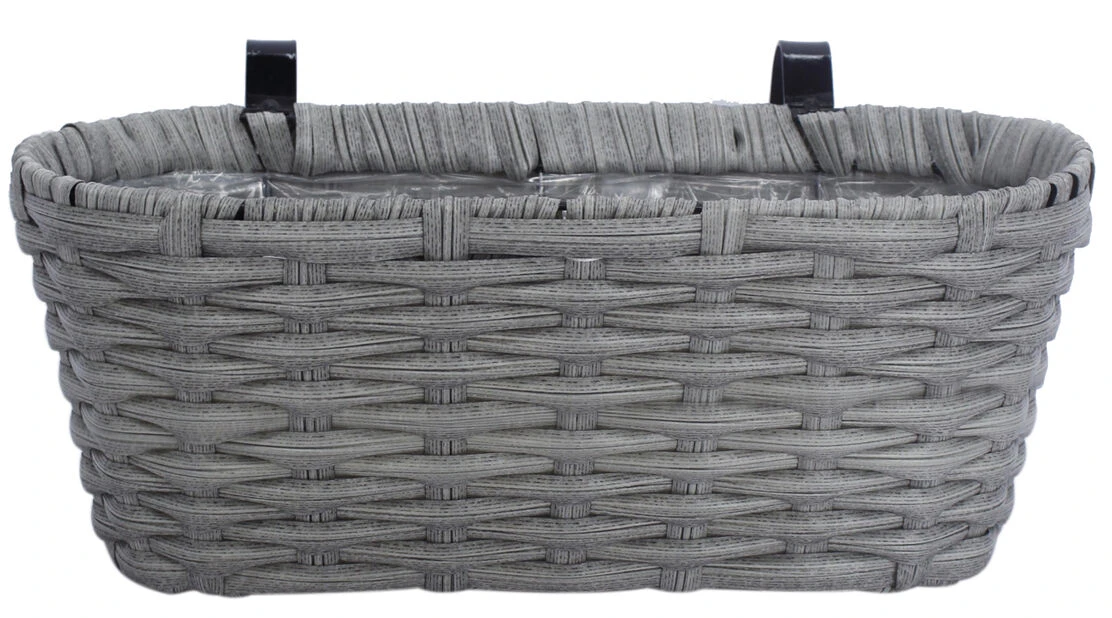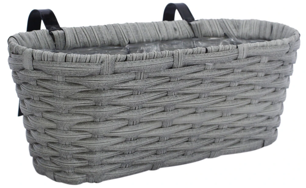 Moderne, balkongkasse i flettet kunstrotting med plastbelagt innside og opphengskroker. Fin å bruke alene eller i kombinasjon med en rottinggruppe. Lengde: 40 cm, bredde: 18 cm, høyde: 16 cm.