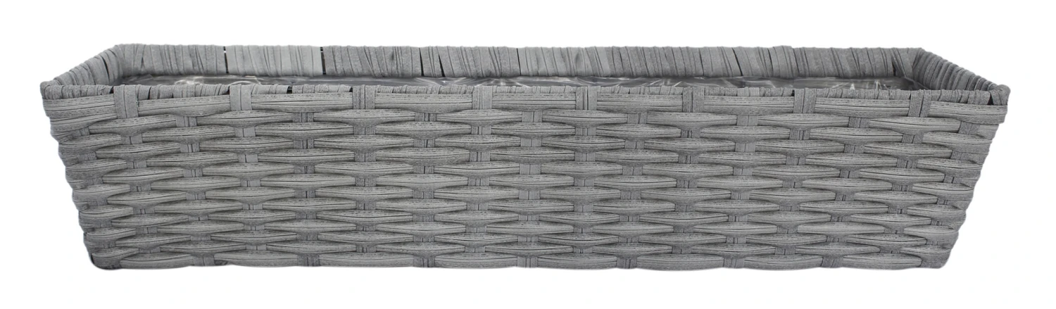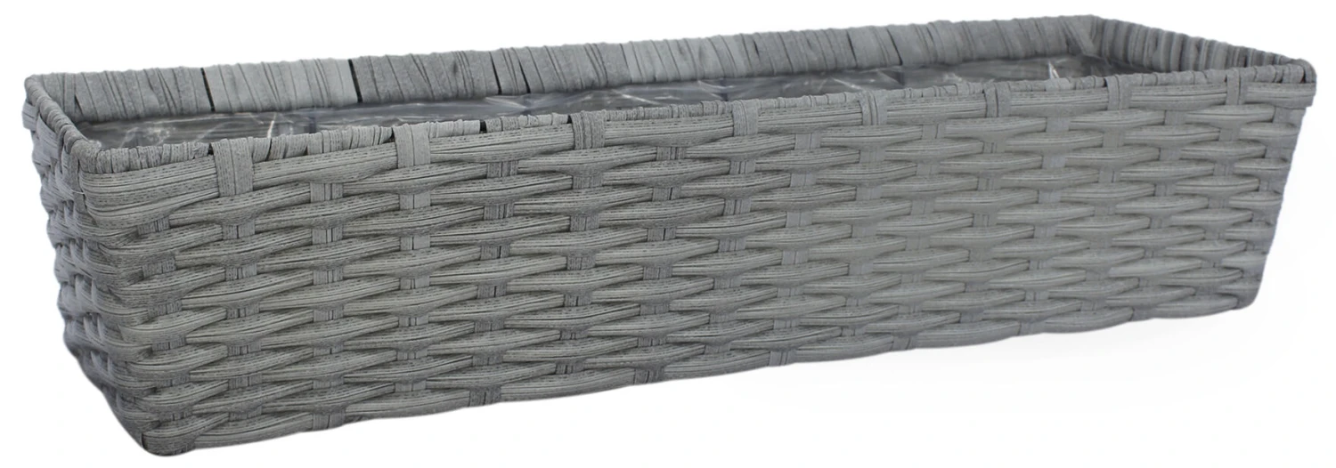 Balkongkasse i moderne, flettet kunstrotting med plastbelagt innside. Perfekt i kombinasjon med en rottinggruppe eller alene som balkongkasse. Lengde: 72 cm, bredde: 21 cm, høyde: 15 cm.