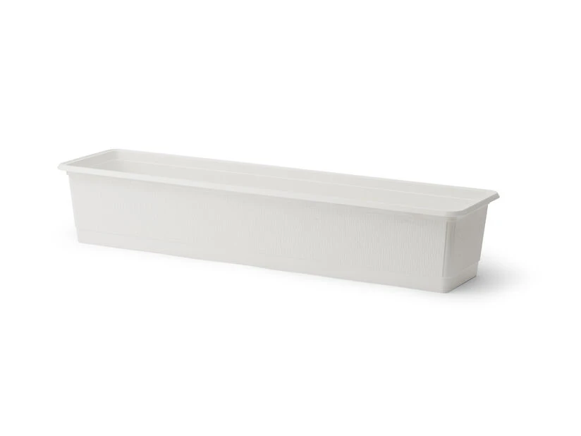 Structure er en stilren balkongkasse i hvit plast, som kan benyttes med beslag alene, eller i eksisterende oppheng av smijern eller annet. MÄtt 70 x 18 x 14 cm.