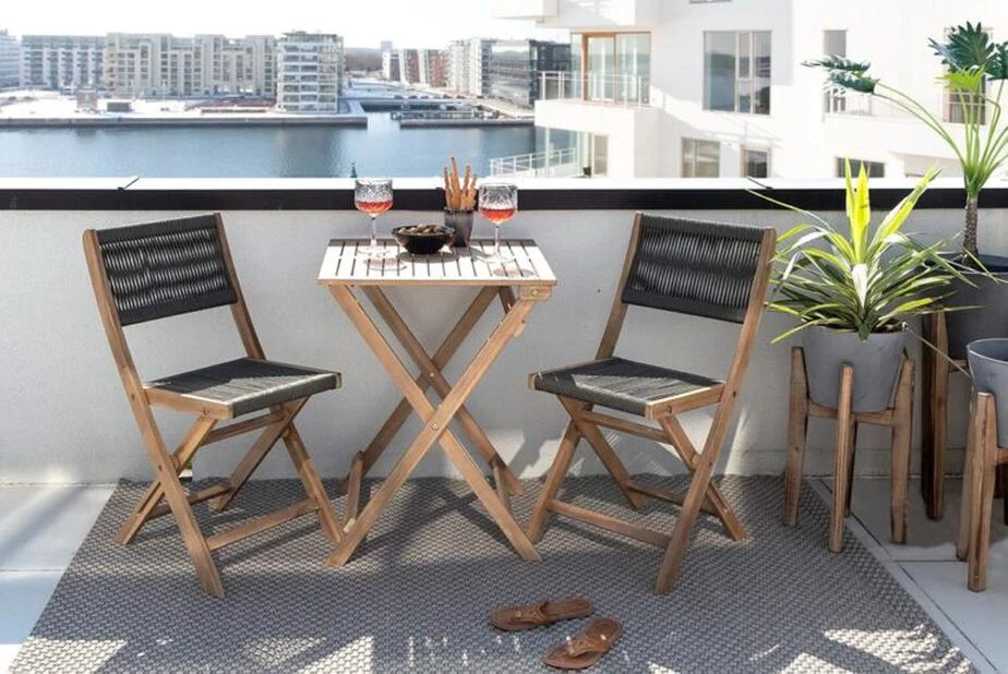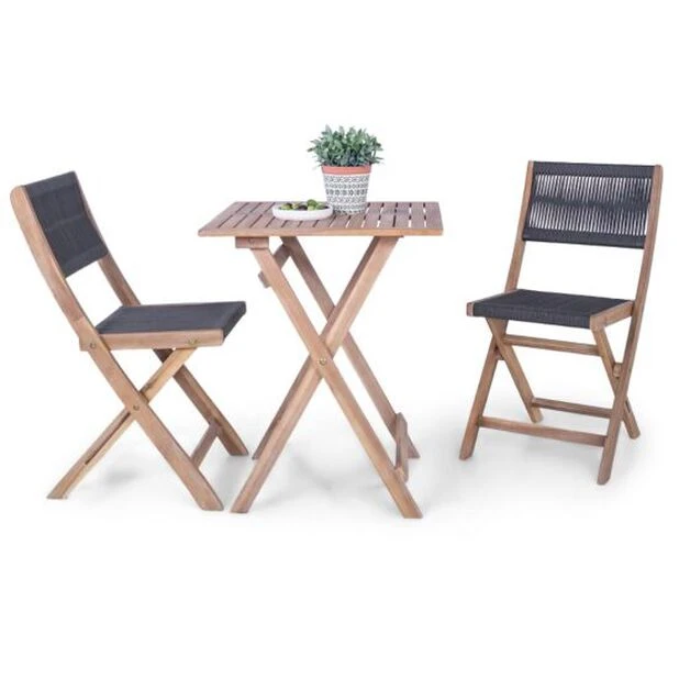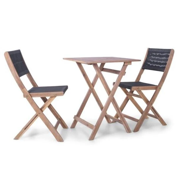 Elegant balkongsett i FSC-sertifisert akasietre med sete og rygg i tau. Perfekt til den lille uteplassen. Settet består av to sammenleggbare stoler og et bord.