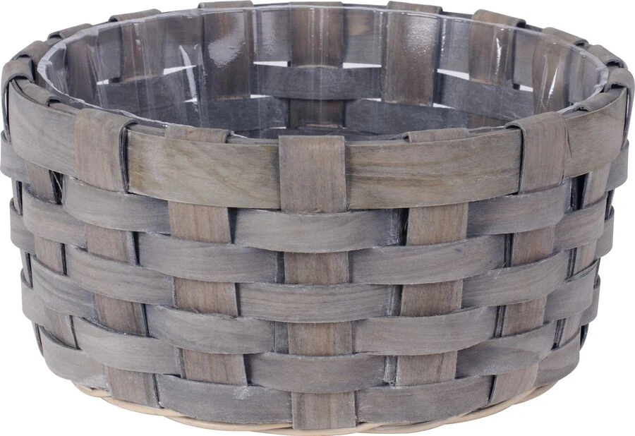 Skål av flettet tre, plastbelagt på innsiden. Ideell til å plante sesongblomster i. Svært fin til f.eks. lyng.