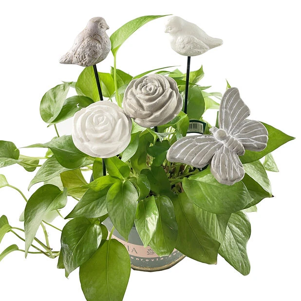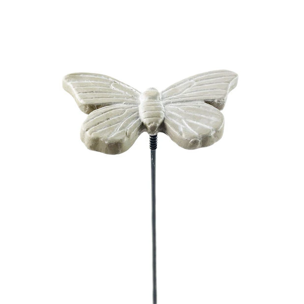 Romantisk sommerfugl til å pynte opp i potter eller bed. Sommerfuglen er i sement og kan med tiden få en fin patina utendørs. Trykk pinnen ned i din fine samplanting og sett den ved inngangen. Fint og spennende blir det også dersom du lar sommerfuglen få plass i bedet.
