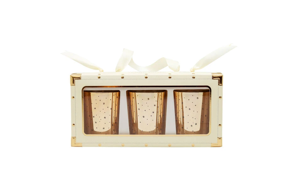 Tre fine duftlys i en vakker gavepakning. Stilfullt dekorerte i gull og hvitt. Brennetid: cirka 22 timer per lys.