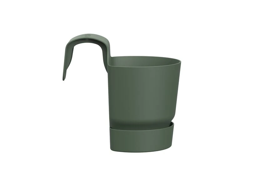 Elho-potten GreenVille for balkongrekkverk i resirkulert plast har en stilren design. Potten er utstyrt med et UV-filter som gjør at den beholder fargen. Overskuddsvann lagres i bunnen av potten. D: 25 cm, H: 24 cm.