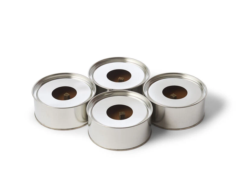 Hvite fakler med lokk og sølvfargede metallbokser. Brennetid: cirka 8 timer. Høyde: 4,5 cm, diameter: 10 cm. Inneholder ikke palmeolje. Kun til utendørs bruk.