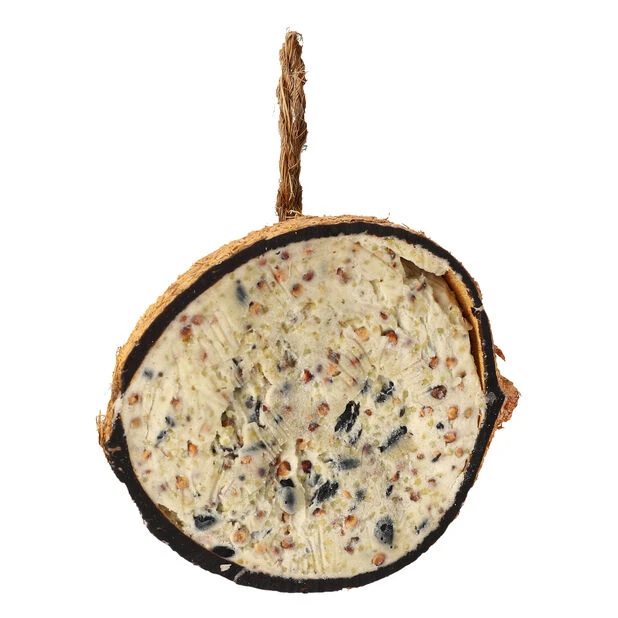 Halv kokosnĂžtt fylt med fett, korn og frĂž. Meget energirik og godt likt av villfugl. Kan praktisk og enkelt henges opp i trĂŠr.