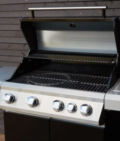 Gassgrill med stor kapasitet. Fire hovedbrennere og en sidebrenner i rustfritt stål med integrert tenning som gir en effekt på 17 kW. Mål: 139 x 53 x 114,5 cm. Grillflate: 73,5 x 43,5 cm.