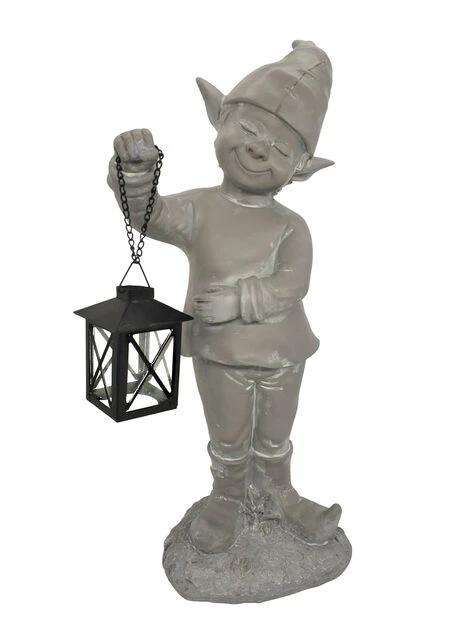 Tradisjonell hagenisse med lykt for telys. Skap stemning i hagen med en klassisk hagenisse som lyser opp i mørket med lys! Matt, grå hagenisse i polyresin-plast.