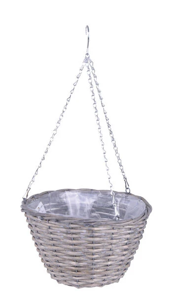 En tradisjonell hengekurv i grå pil, plastbelagt på innisden. Utmerket som potteskjuler til skåler ved inngangen eller på balkongen. Bredde 31cm, høyde 19cm.