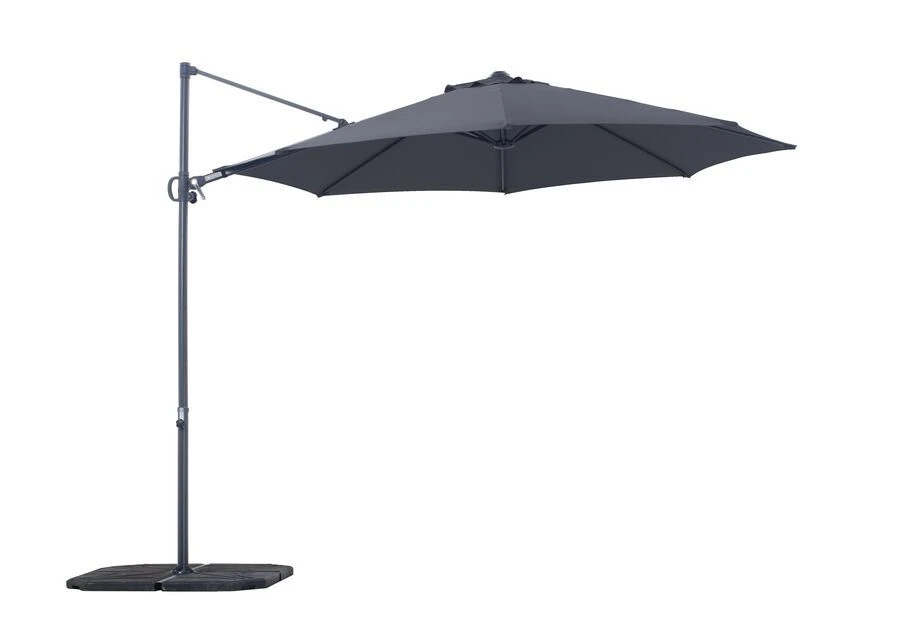 Fritthengende parasoll med sveiv. Aluminiumsstang og UV-bestandig polyester. Enkel justering med trinnløs regulering. Fotkryss er inkludert. Mål: parasoll Ø 3 m, stolpe 45 x 64 mm.