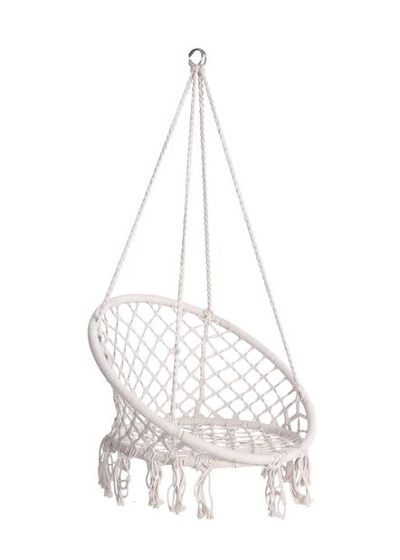 Slapp av i skyggen med en god bok i denne herlige hengestolen i bohemsk stil! Hengestolen er ikke bare god å ligge i, den er også vakker å se på. Den har en fint avrundet form med dekorative frynser nederst og er laget i hvitt tau i slitesterk bomull- og polyestermiks – et vakkert blikkfang i hagen. Du kan feste hengestolen i et tre, i taket på uteplassen eller innendørs. Maksimal vektbelastning: 120 kg. Sørg for å henge opp stolen ordentlig på en krok (følger ikke med) som er godt forankret i taket og er beregnet for formålet. Hvis du skal henge stolen rundt et tre, må du ha ekstra tau (følger ikke med) slik at den festes ordentlig.