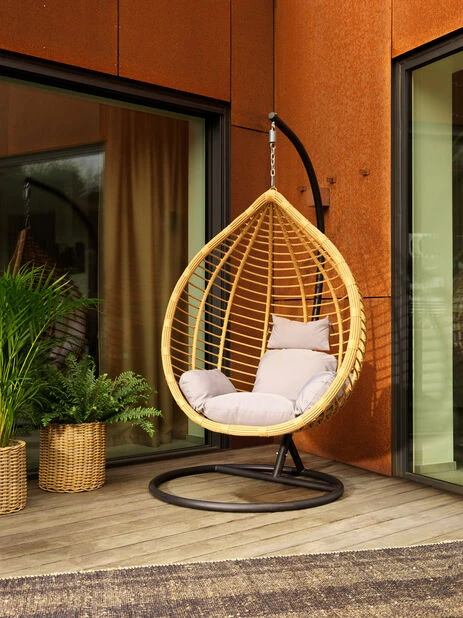 Valencia er en komfortabel hengestol som det er godt å krype opp i med en god bok eller en kopp kaffe. Det flotte knoppformede designet gir en lun og innbydende følelse. Hengestolen er laget av pulverlakkert stål og kunstrotting og kan stå både ute og inne. Stativet har en rund, stabil fot som gjør at du enkelt kan plassere hengestolen der den passer best. Maksimal vektbelastning: 120 kg. De herlige putene er trukket med eksklusiv, værbestandig vevd polyester som kan tas av og vaskes på 40 grader.