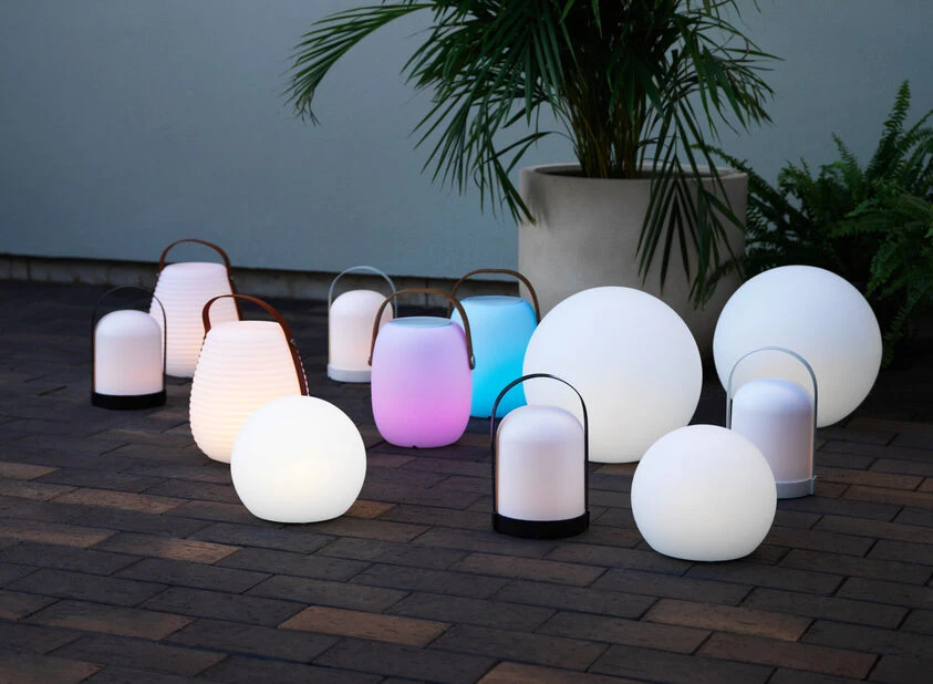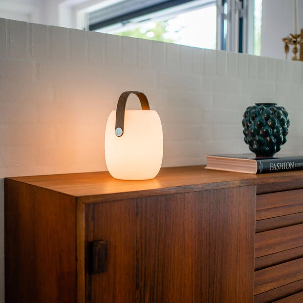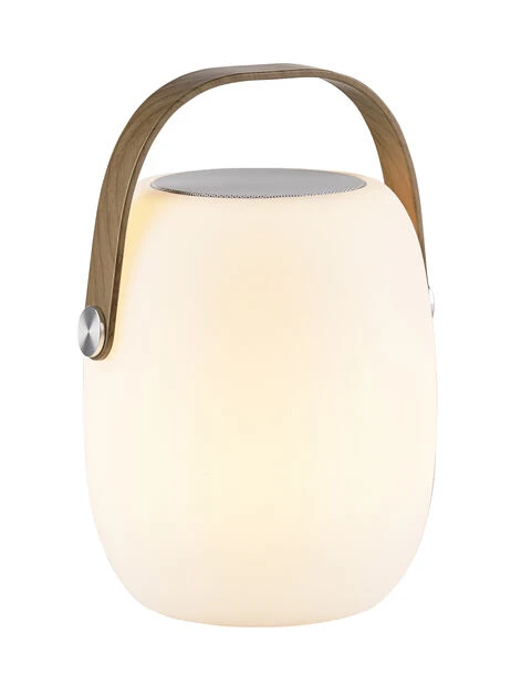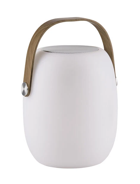 Moderne høyttalerlampe med håndtak i imitert tre som forgyller og skaper herlig stemning på sommerkveldene. Bluetoothtilkobling og lamper som skifter farge. Mål: Ø18 cm, høyde: 27 cm.