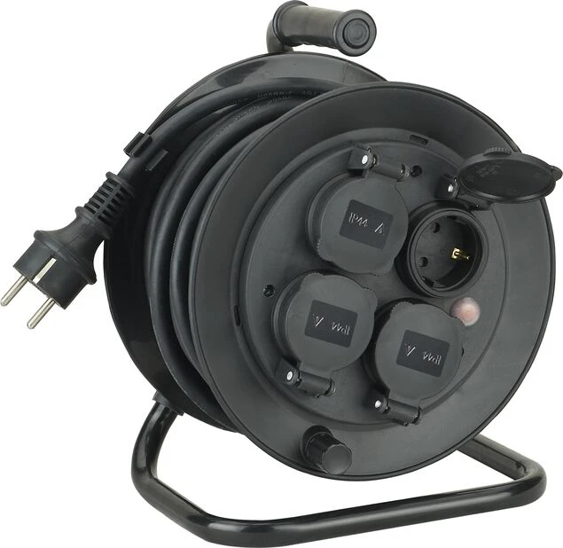 Utendørsgodkjent kabeltrommel med 15 meter lang, gummibelagt skjøteledning og 4 jordede strømuttak. Maks. belastning: 900 W sammenrullet, 2300 W helt utrullet kabel.