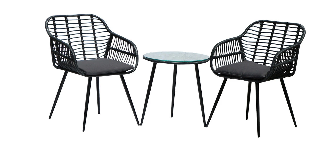 • Moderne, sort kafésett i form av to stoler og et bord i kunstrotting med skandinavisk design.