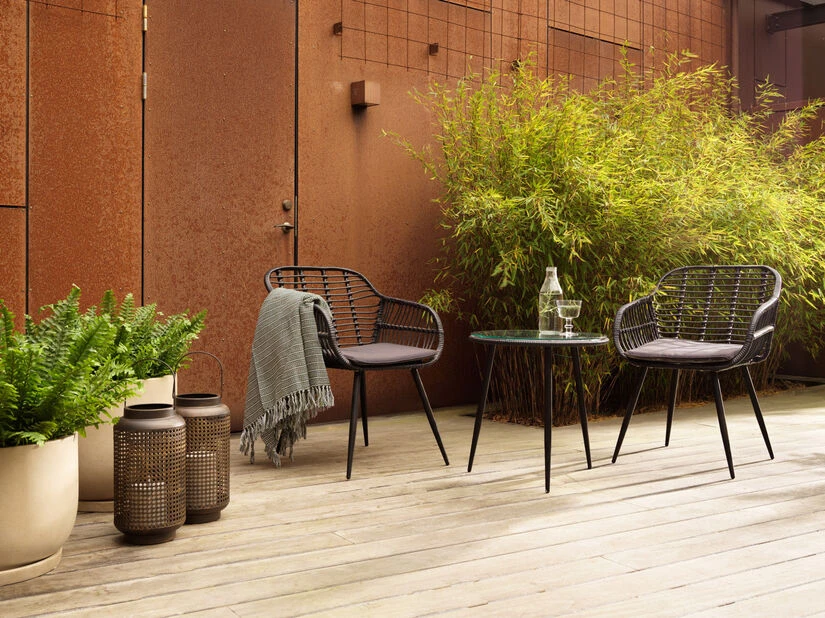 Skap et koselig loungehjørne på balkong eller uteplass med et moderne kafésett! Loudes kafésett er et stilig kafésett i kunstrotting med kurvstoler i minimalistisk design og tilhørende rundt bord med glassplate. Kafesettet er laget av værbestandig kunstrotting og leveres med 2 cm tykke puter med mål på 45 x 39 cm. Settet finnes også i naturfarge. Kafésettets størrelse passer godt på en balkong eller liten uteplass, perfekt for å nyte morgenkaffen eller lese en god bok! Maksimal vektbelastning: 120 kg.