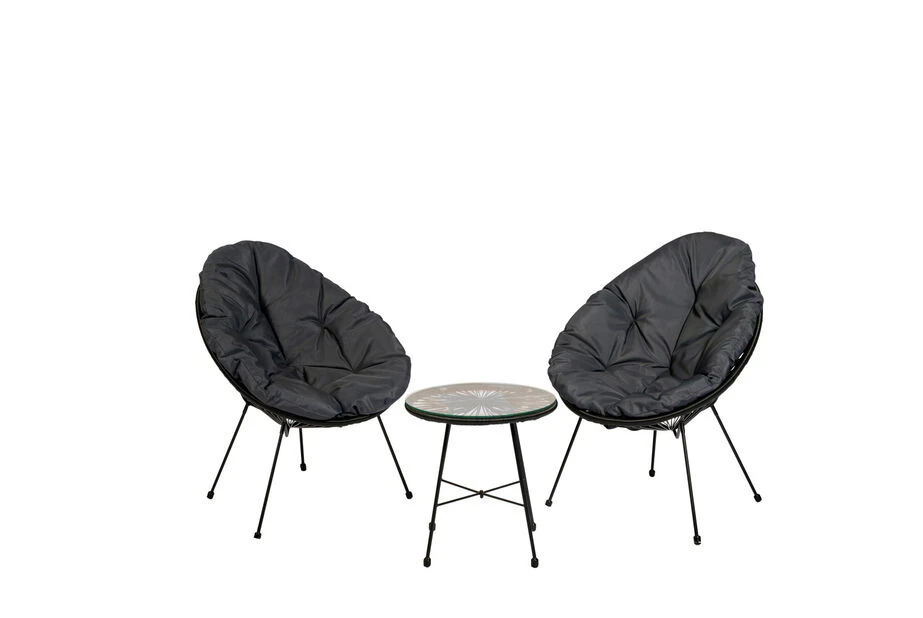 Stilrent kafésett i svart stål og kunstrotting. To rottingstoler og et rundt bord med tykke og myke svarte puter medfølger. Perfekt til balkongen eller uteplassen!
