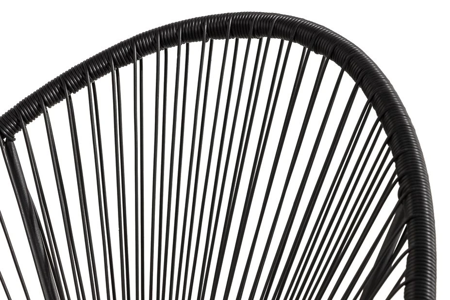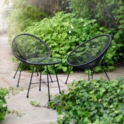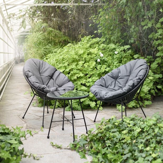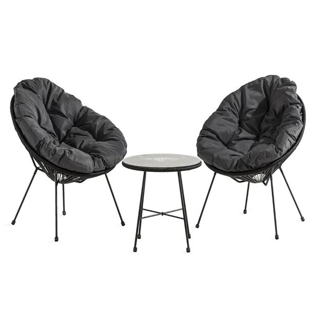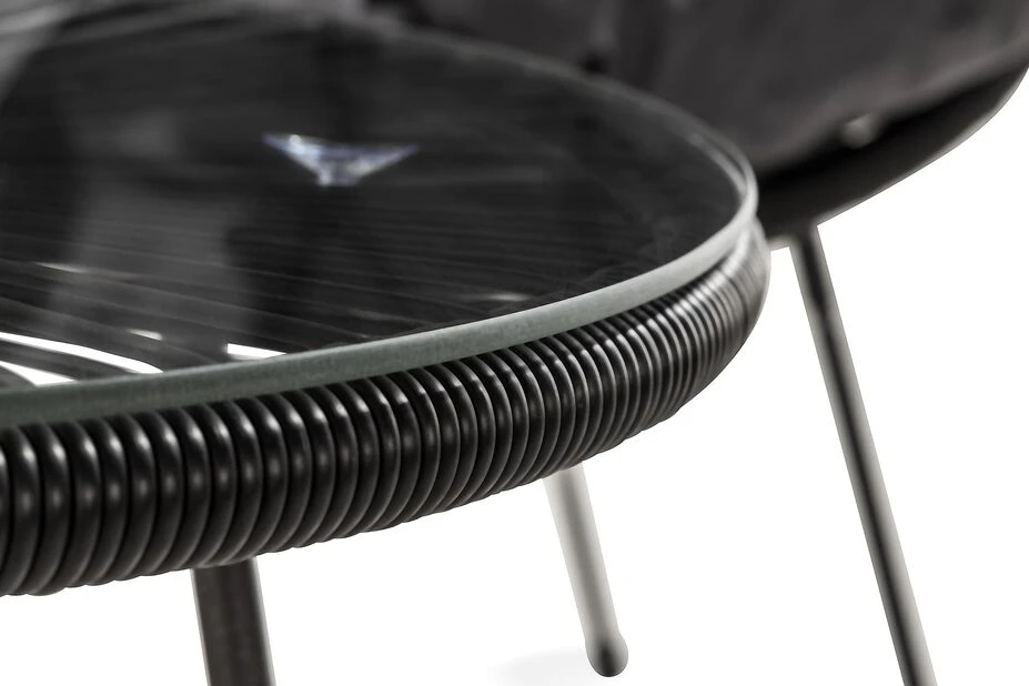 Trendy kafésett i svart stål og kunstrotting. Består av to trådstoler og et rundt bord, samt tykke, deilige puter i mørkegrått. Perfekt til balkongen eller den lille uteplassen!