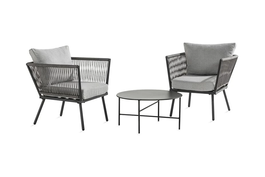 Stilrent kafésett med stoler og lavt, rundt bord. Perfekt til balkongen eller den lille uteplassen. I slitesterk aluminium og tau i polyester. Lysegrå puter er inkludert.