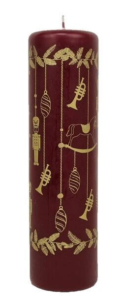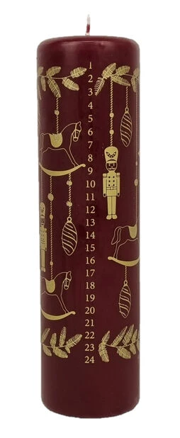 Tradisjonelt rødt kalenderlys i parafin, nummerert fra 1 til 24, med motiv av nøtteknekker, gyngehest og girlander. Tell ned til julaften med et stemningsfullt kalenderlys! Brennetid ca. 110 timer.