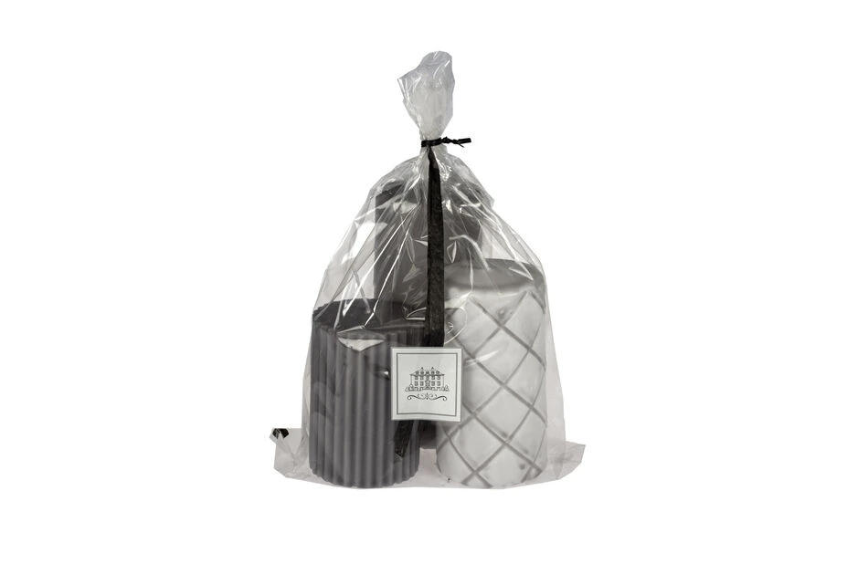 Grå kubbelys i en fin gavepose. Tre fine kubbelys med forskjellig struktur: riflet, rutete og glatt. Inneholder ikke palmeolje. Brennetid: ca. 26/32/42 timer. Høyde: 9/11/14 cm, diameter: 5,8 cm.