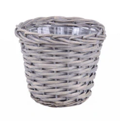 En tradisjonell kurv i grå pil, plastbelagt på innisden. Utmerket som potteskjuler ute som inne. Diameter 18cm, høyde 15cm.