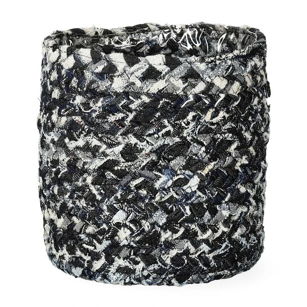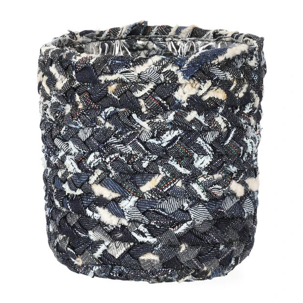 Stilig og unik blå kurv fremstilt av bomullsrester fra jeansproduksjon. Beregnet til innendørsbruk. Potten har en tynn plastinnsats, men den bør kombineres med en tett innerpotte, et potteunderlag eller vanntett fat som beskytter mot fukt på underlag. Mål: Ø12 cm, høyde: 12 cm.