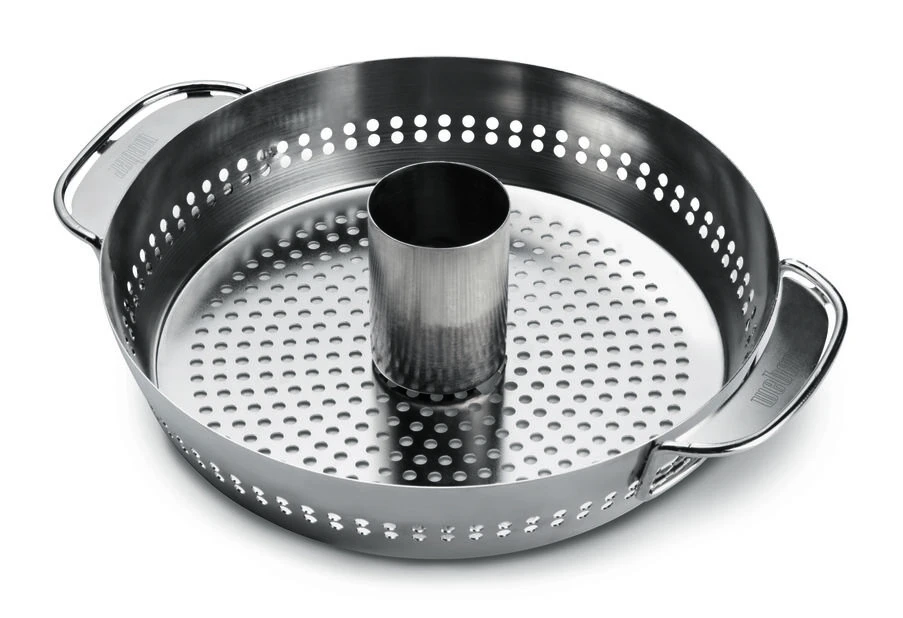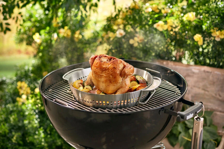 Kyllingholder til Gourmet BBQ System med 2-i-1 funksjon. Mulighet for tilberedning av hel kylling og en god posjon grønnsaker – samtidig eller hver for seg.