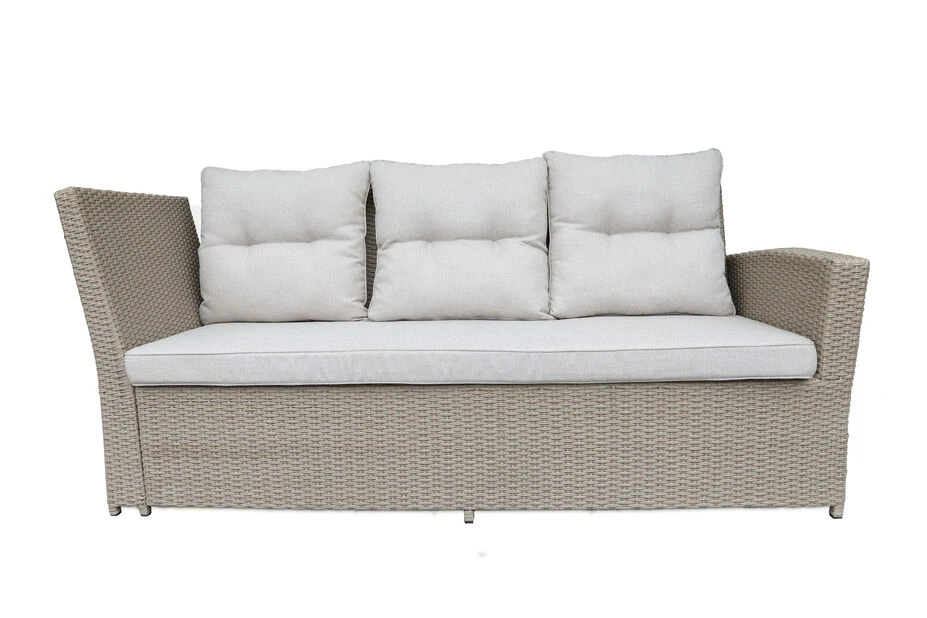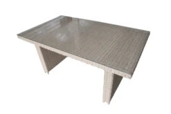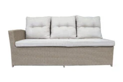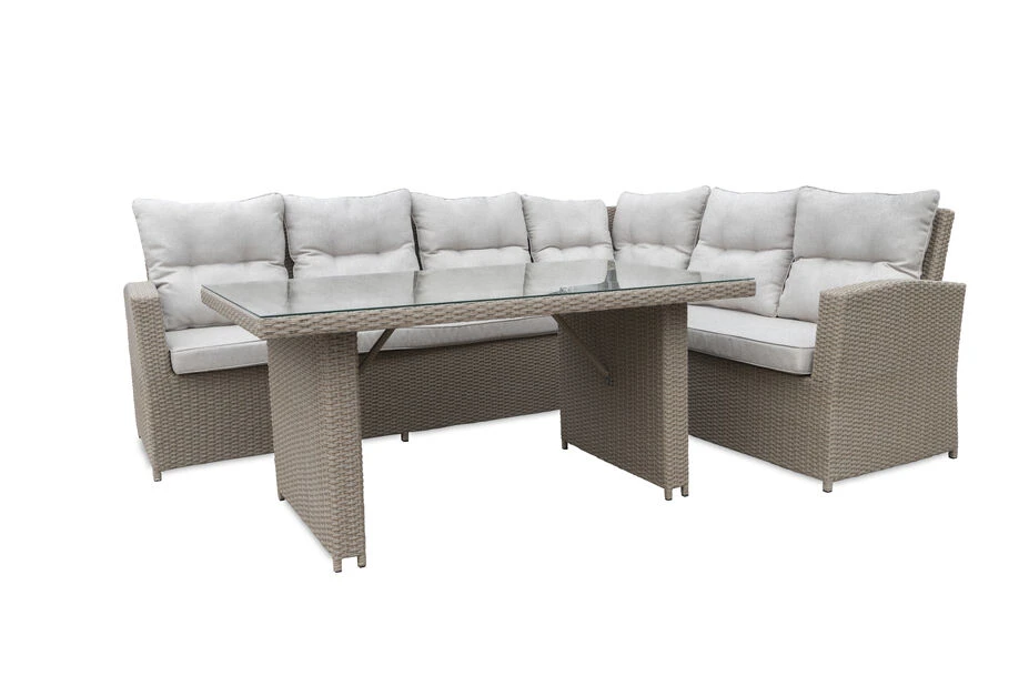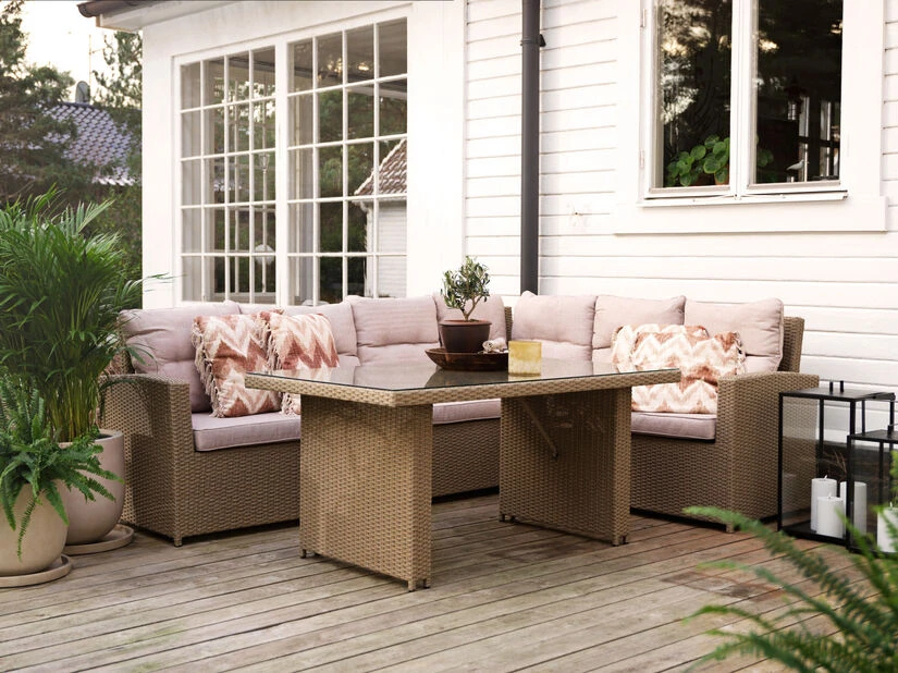 En hjørnesofa er et praktisk utemøbel som har plass til mange. Loungesettet Alicante består av en romslig loungesofa i glatt, UV-bestandig kunstrotting og aluminium med hele sju sitteplasser og et solid bord. Sofaens høye rygg og myke puter gjør den svært komfortabel å sitte i. Det store bordet har plate i 5 mm herdet glass, og høyden er perfekt for å ta en matbit eller en kaffe. Puter i vevd polyester (230 g/m2) er inkludert.