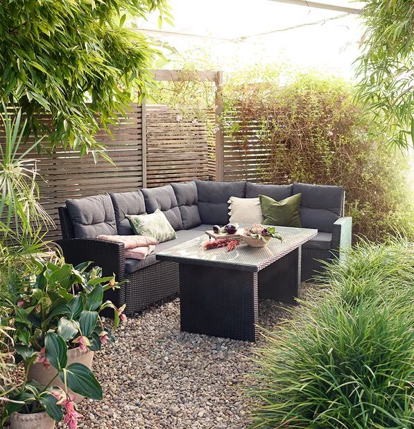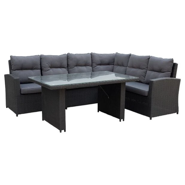 En hjørnesofa er et praktisk utemøbel som har plass til mange. Loungesettet Alicante består av en romslig loungesofa i glatt, UV-bestandig kunstrotting og aluminium med hele sju sitteplasser og et solid bord. Sofaens høye rygg og myke puter gjør den svært komfortabel å sitte i. Det store bordet har plate i 5 mm herdet glass, og høyden er perfekt for å ta en matbit eller en kaffe. Puter i vevd polyester (230 g/m2) er inkludert. Maksimal vektbelastning: 120 kg.