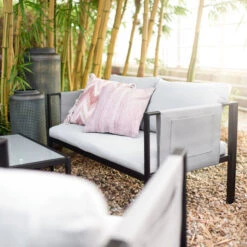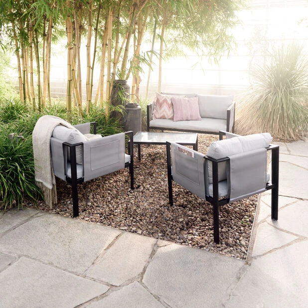 Stilrent, minimalistisk loungesett i svart, pulverlakkert stÄl. Settet bestÄr av en sofa, to stoler og et sofabord. GrÄ puter i slitesterk polyester er inkludert.