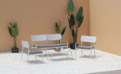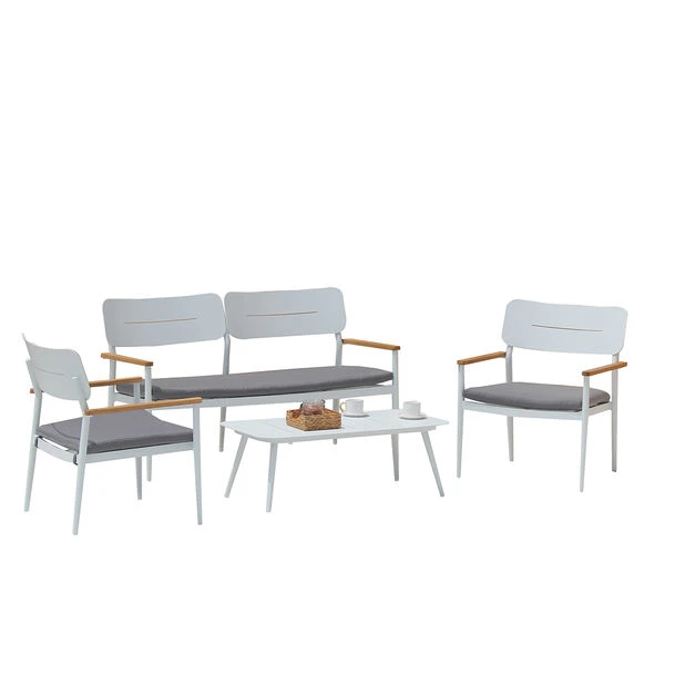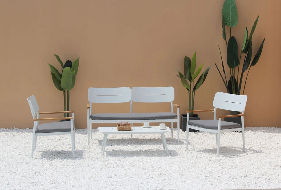 Denne nette sofagruppen i hvit, pulverlakkert aluminium er den perfekte utegruppen for smÄ uteplasser. Det moderne formsprÄket og de vakre detaljene i teak gir et luftig, tidlÞst uttrykk som passer inn i de fleste miljÞer. Settet bestÄr ogsÄ av et lavt bord og grÄ sitteputer i vevd, vÊrbestandig polyester for lettstelt komfort. Piff gjerne opp med tepper og en fin plante pÄ bordet for Ä skape en ekstra hjemmekoselig fÞlelse.