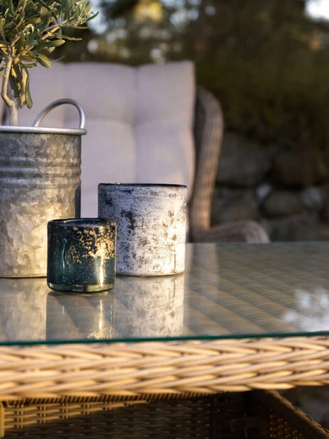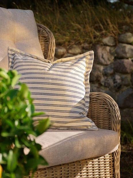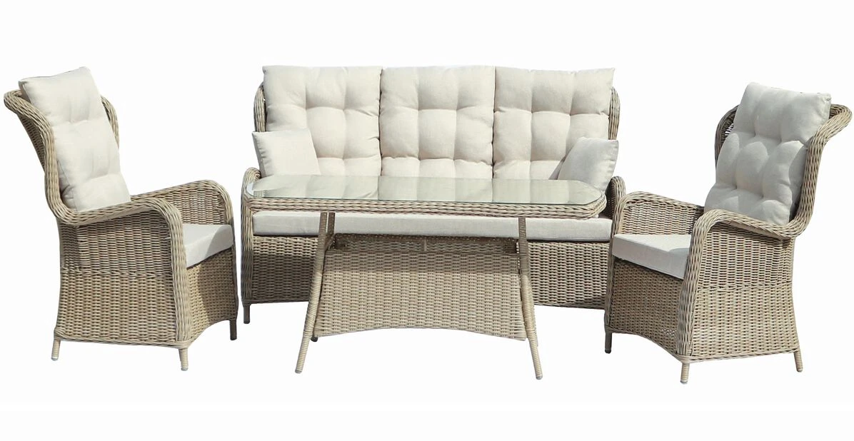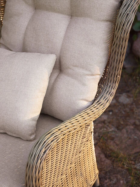 Elegant sofagruppe i naturfarget, UV-bestandig kunstrotting med ramme i aluminium. Består av sofa og stoler med høy rygg og tykke puter av førsteklasses kvalitet, samt et høyt bord med glassplate. Slå deg ned og nyt livet i denne behagelige sofagruppen! Den høye ryggen og de luksuriøse, tykke putene gjør sofagruppen til et herlig, avkoblende sted på lyse sommerkvelder og varme høstdager. Nantes er en klassisk sofagruppe som passer like godt på terrassen som i hagestuen. Møblene er laget av stabil og vedlikeholdsfri, halvrund kunstrotting som gir en eksklusiv følelse. Lekkert sandfargede, 8 cm tykke puter i værbestandig, vevd polyester (230 g/m2) er inkludert. Putene har avtakbart trekk som kan vaskes på 40 grader.