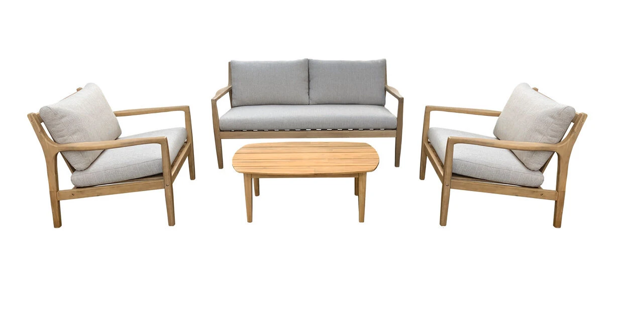 ⢠Minimalistisk loungesett i akasietre i skandinavisk design.