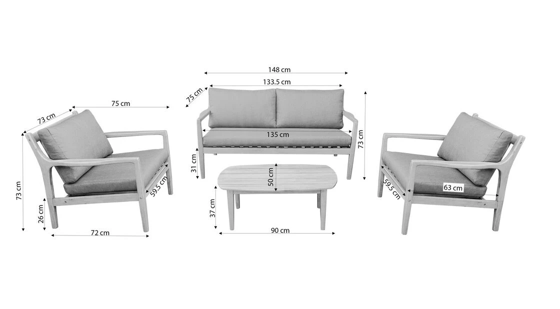 Skap et hyggelig rom i hagen, pü terrassen og balkongen med et stilrent loungesett! Loungesett Stavern er et klassisk loungesett i minimalistisk, skandinavisk design med materialer av høy kvalitet og rolige, behagelige farger. Møblene i loungesettet er laget av den vakre og vÌrbestandige tresorten FSC-merket akasie, og settet bestür av en komfortabel 2-seters sofa, to gode stoler og et praktisk sofabord. Trekket bestür av det vÌrbestandige og lettstelte stoffet olefin, som tüler vÌr og vind og holder seg fint lenge. Nyt hele sommeren fra vürens første solstrüler til høstens regn og ruskevÌr. Oppbevar møblene innendørs om vinteren, eller beskytt dem med møbeltrekk. Møblenes innsatser bestür av galvanisert stül som er rustfritt med lang holdbarhet. Mül stol: Høyde 73 cm, bredde 75 cm, lengde 73 cm, setehøyde 31 cm, setebredde 59,5 cm, setedybde 65 cm. Bord: høyde 37 cm, bredde 90 cm, lengde 50 cm. Sofa: høyde 73 cm, bredde 75 cm, lengde 1,48 m. Total setebredde 1,35 m, setehøyde 31 cm, setedybde 65 cm. Maksimal vektbelastning: 120 kg.