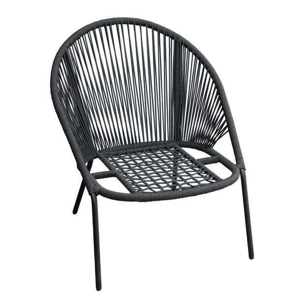 En elegant loungestol i tau med rund form og tidlÞs design. Perfekt pÄ balkongen eller terrassen. Kan stables. MÞrkegrÄ pute er inkludert.