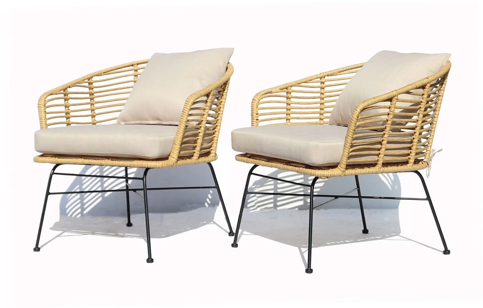 Stilrene loungestoler i naturfarget kunstrotting. Like fine i hagestuen som på terrassen. Puter og ryggputer er inkludert.
