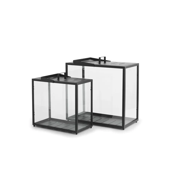 Moderne, firkantet lykt i stilrent design med glass i svarte metallrammer. Passer til kubbelys og LED-kubbelys. Kan brukes bĂĽde inne og ute. MĂĽl: 38 x 20 x 35 cm.