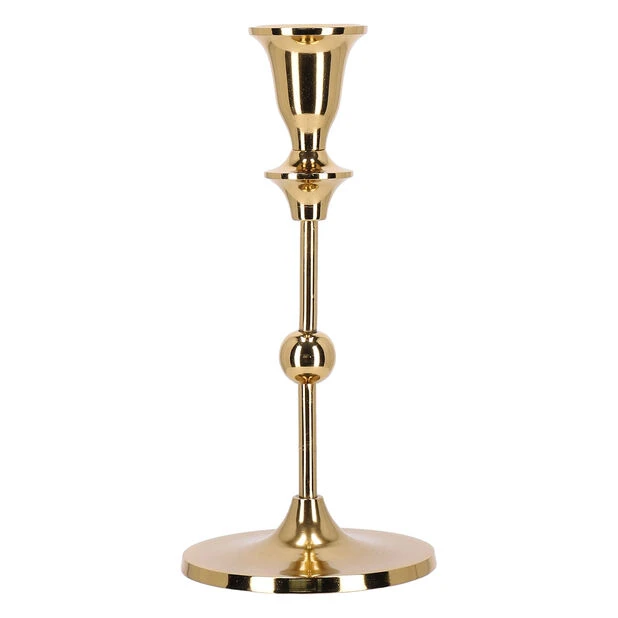 Tenn et lys og lys opp hverdagen med denne vakre lysestaken i klassisk, tradisjonell stil. Utformet av aluminium belagt med blank gullfarget ytre. Passer til kronelys. Høyde: 23 cm, ø11,5 cm.
