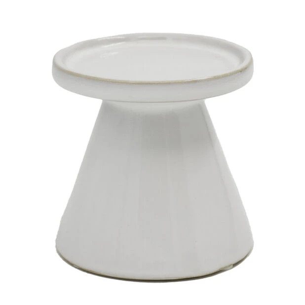 Minimalistisk, hvit lysestake til kubbelys i moderne design med kjegleformet fot og plattform til lyset. Lav lyslykt i keramikk med blank, hvit glasering. Beregnet for innendørs bruk.