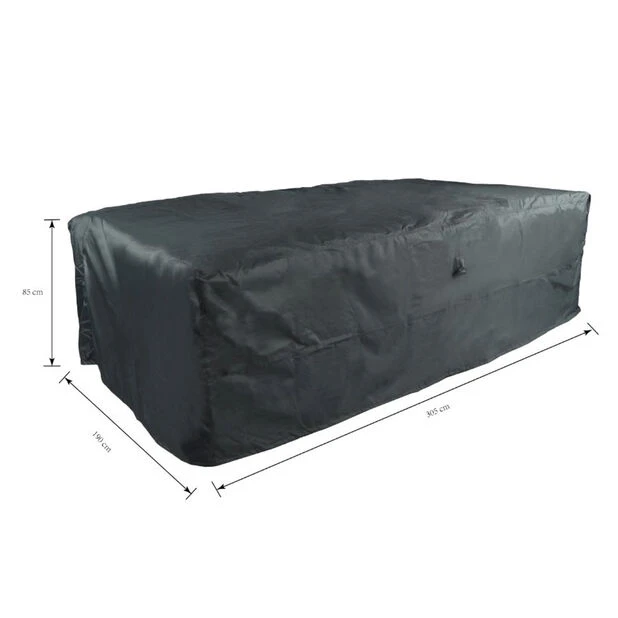 Slitesterkt trekk i vannavstøtende Oxford polyesterduk 600D. Beskytter bord, stoler og andre utemøbler. Mål: 305 x 190 x 85 cm.