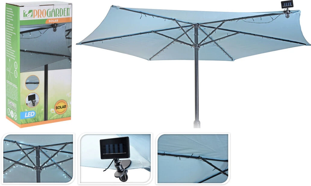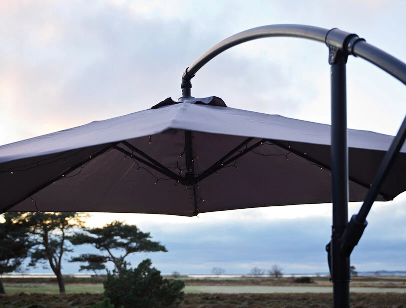 Solcelledrevet lyslenke til parasoll med 72 LED-lys. Forleng sommerkveldene på altanen med belysning til parasollen. 6 x 12 LED-lys per lyslenke, festes enkelt på parasollen.