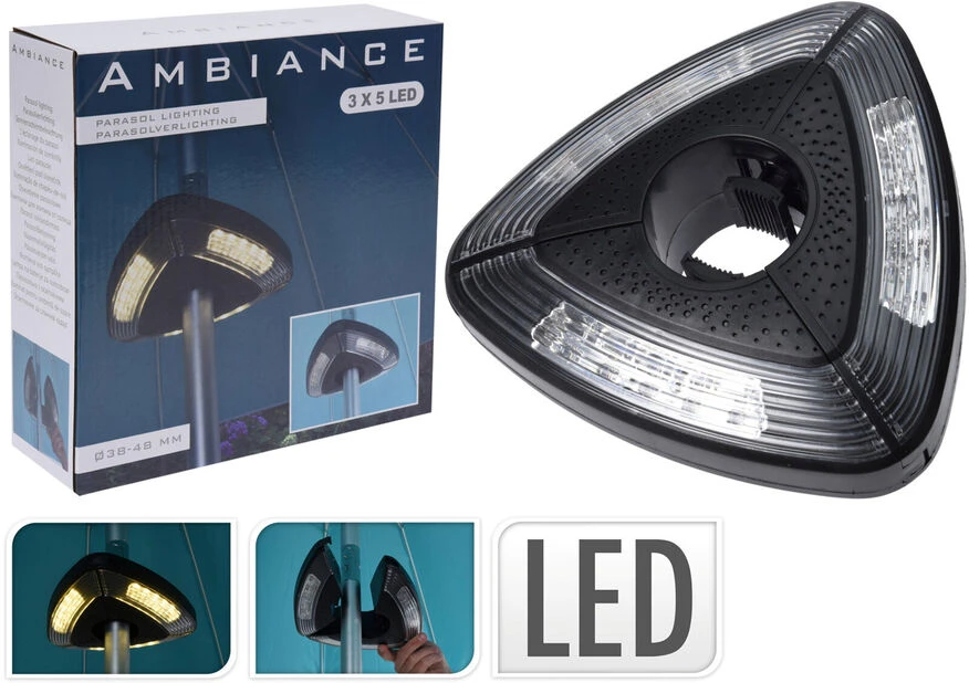 Parasollbelysning er en fleksibel lÞsning for Ä lyse opp uteplassen. Denne trekantformede parasollbelysningen i plast er utstyrt med 15 LED-lys i varmhvitt lys, Fest lampen rundt stolpen pÄ parasollen og la lyset skinne under sommerens middagsselskaper og fester. Parasolllyset har av/pÄ-knapp og drives av 2 x AA-batterier, selges separat. Belysningen er CE-sertifisert.