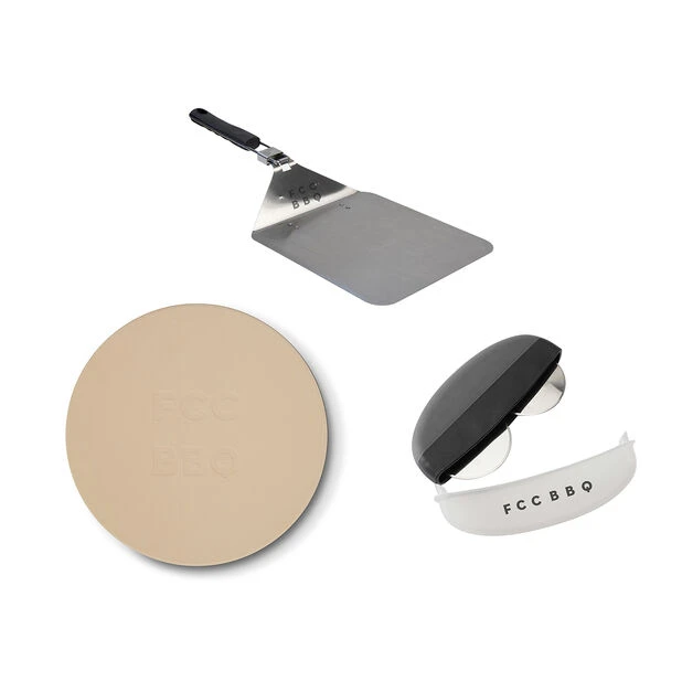 Komplett pizzasett i tre deler med sammenfoldbar pizzaspade, dobbel pizzaskjærer og pizzastein i kordieritt. Passer til FCC BBQ Multi Grill System. Mål for pizzasteinen: Ø 30,5 cm