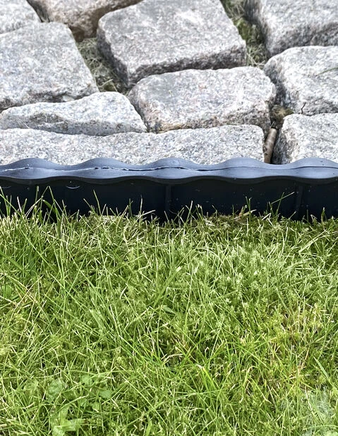 Hagekant eller plenkant som skiller av og tydeliggjør grensen mellom to områder som plenen og grusen. I resirkulert PVC-plast. Inneholder syv deler; L: 60 cm, H: 12 cm, B: 1 cm. Total lengde: 420 cm.