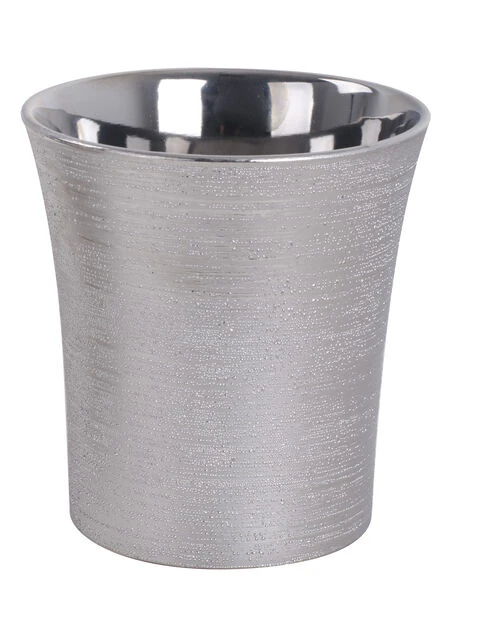 Moderne, sølvfarget potte med riflet mønster. Passer utmerket til amaryllis og andre juleblomster. Diameter: 13,5 cm, høyde: 13,5 cm. Passer til innerpotte med diameter 10 cm.
