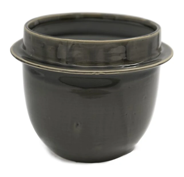 Moderne, glasert, grå keramikkpotte med dekorativ kant øverst. Mål: Ø21,5 cm, høyde: 17,5 cm. Beregnet til innendørsbruk. Finnes i to ulike størrelser.